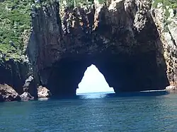 This natural arch passes through the islet Aorangaia from east to west. A small vessel can fit through easily.
