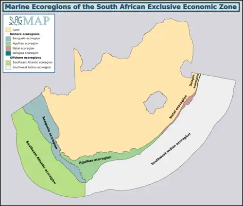 South Africa's coastal waters can be divided into a number of biogeographical regions, though there is generally not a sharp distinction between them where the boundaries have been placed. There is more of a gradual change along the coast, from the tropical waters of northern KwaZulu-Natal to the cooler waters of the south coast.