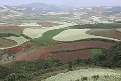 - 🌍 Dongchuan Red Land (东川红土地 Dōngchuān Hóngtǔdì) (Two direct buses per day to Fazhe (法者) via Hongtudi leave Kunming North bus station at 07:50 and 08:30, take 4h, and cost ¥43. These buses should stop at Longtoujie metro about 15 minutes later. There are more buses available to Dongchuan town and to Majie (马街), from where you can take a bus or shuttle van the rest of the way.). This area has terraced fields of red earth, with different crops in different fields, leading to a patchwork of colour that is particularly attractive in spring and fall when there are flowers. Although several viewpoints are within walking distance of the central town, the rest of the scenic area is quite spread out, it's a bit remote, and there's not much to do other than look at dirt, so it's popular mainly with photographers. The locals have started building guest houses to accommodate tourists, in place of farming, which means some of the fields are now left fallow (a much less attractive gray in spring). As of 2018, the area is still not heavily developed for tourism and does not charge admission or inflated prices. 8-10 viewpoints have names, small pull-offs for parking, and in some cases toilets. free.