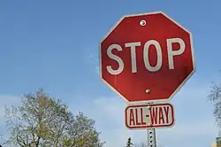 - Instead of yielding rules or roundabouts, smaller road junctions are often signposted as all-way stops (aka 4-way stops, 3-way stops). This means every car coming to the junction must fully stop at the sign, then proceed through the intersection in the order that they arrived. This works better than you'd think, but if there's any doubt who's first, make eye contact with the other driver(s) and signal who can go first. If turning, right turns go first.