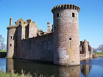 - 🌍 Caerlaverock Castle, Castle Road End, Glencaple DG1 4RU (7 miles south of Dumfries on B725, east of river), ☏ +44 1387 770244. 1 Apr to 30 Sep: daily 9:30AM-5:30PM, last entry 5PM; 1 Oct to 31 Mar: daily 10AM-4PM, last entry 3:30PM. Impressive twin-towered triangular castle surrounded by a water filled moat. It was completed in 1270 and wrecked and rebuilt until 1640 when it was abandoned. It's scenic and often used as a film location. An earlier square castle of 1230 is 200 yards south: only foundations remain, and probably it was left unfinished when the advantages of the "new" site were seen. Adult (16-64) £6, concession (65+) £4.50, child (7-15) £3.50, child under 7 free.