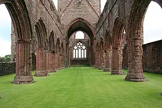 - 🌍 Sweetheart Abbey, New Abbey DG2 8BU (on A710 eight miles south of Dumfries, west of the river). Apr-Sep daily 9:30AM-5:30PM, Oct-Mar Sa-W 10AM-4PM. This is the remains of a Cistercian Abbey founded in 1275 (hence the nearby village is called "New Abbey"; the old abbey was Dundrennan to the west near Kirkcudbright). It was founded by Devorguilla in memory of her husband John de Balliol, and she also endowed the Oxford college named for him. She carried his embalmed heart around everywhere in a casket of ivory and silver, until it was buried with her here, though the grave is now lost. In 2024 much of the site is closed awaiting repairs, though you can look at the cloister free .