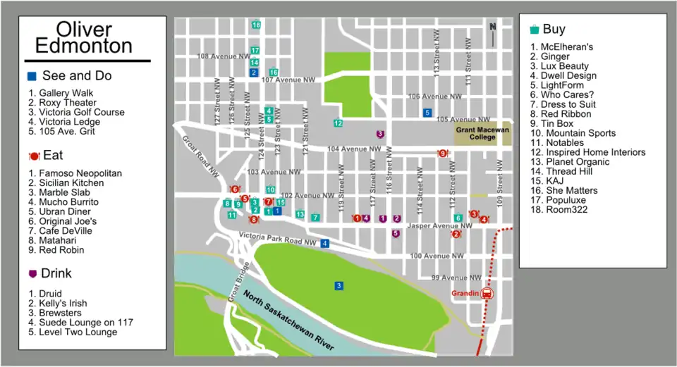 Block to Shop(124 between Jasper and 102 Ave NW). This area is home to a nice concentration of woman's boutiques. Most of these cater to professional women and are quite stylish and lead in brands and price range (some with cheap prices). Some of the stores also carry menswear. There are also a few restaurants.