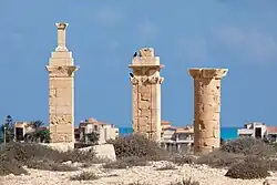 Just east of the Marina, and 5 km northeast of El Alamein is Leukaspis (Greek:Λεύκασπις), also known as Antiphrai (Greek: Ἀντίφραι). Leukaspis was a port city during Classical antiquity, and today it is an archaeological site with Greek and Roman ruins. It's one of the best preserved sites right on the Mediterranean coast.