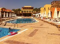 - 🌍 Cook’s Club El Gouna (former Arena Inn), ☏ +20 65 358 0078. A mid-sized hotel, for adults only, opened in 2019 in the building of the former Arena Inn. 144 hotel rooms in three main buildings facing the lagoon on one side and the golf course on the other. Rooms have satellite tv, air conditioning, bathroom with shower, mini fridge, safe and a balcony as well as free Wi-Fi. There's a self-service restaurant and a cocktail bar at the pool. Built along the saltwater lagoon that separates the island of Kafr El Gouna from the Downtown mainland area, the hotel offers a waterfront setting close to the facilities and services of El Gouna. Cafés, restaurants, supermarkets, shopping galleries, and evening entertainment venues with live music and shows are within walking distance. The hotel's infinity pool overlooks a swimming lagoon bordered by a small sandy beach. Arena Inn guests also have access to the hotel's sea beach on nearby Zeytouna Island, reached by shuttle boat or bus, where snorkeling is available. budget.