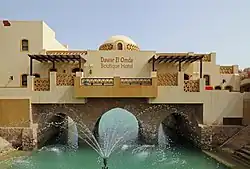 - 🌍 Dawar El Omda Boutique Hotel, ☏ +20 65 358 0063. Non-smoking hotel for adults (guests need to be at least 18 years old) built in 1996 and renovated in 2013. There are 66 double rooms; 23 standard, 40 deluxe and three suites and the hotel is built and decorated in Oriental style. Rooms have A/C, balcony, bathroom with shower, safe, satellite tv, and minibar. The hotel has a pool, a "main" restaurant (no reservations required), the Middle-eastern Restaurant El Tableya and Restaurant Just For Two (reservation required for both), a lounge bar and a pool bar. Public areas have free Wi-Fi, it's payable in the rooms. Guests have free access to Zeytouna Beach. All major credit cards are accepted. upmarket.