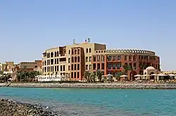 - 🌍 Mövenpick Resort & Spa El Gouna, ☏ +20 65 354 4501, fax: +20 65 354 5160. Built in 1995, renovated in 2014, this hotel is nestled on a peninsula, with its own beachfront. It offers spectacular views of the Red Sea, the tranquil lagoons and the lush gardens. There's a main restaurant and several specialized ones (Thai, Middle-eastern, Mediterranean, seafood). The garden terrace has four swimming pools, and there's a spa, fitness room, different sports facilities plus a children's club with playgrounds. There's a diving operator (Euro Divers) and a kite- and windsurfing center. Rooms have a/c, satellite TV, minibar, safe, balcony and bathroom with shower. Paid Wi-Fi. Downtown with its picturesque architecture and numerous attractions is a few minutes away and Hurghada International Airport can be reached in 30 minutes. upmarket.