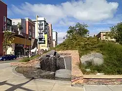 - π Shellmound Memorial, Shellmound Street and Ohlone Way. The Bay Street mall, now Emeryville's nicest shopping area, was once the site of a prehistoric shellmound, or midden, a mound of shells and other food waste left by the area's indigenous inhabitants in generations past. People lived at the site from about 2,800 years ago to 600 years ago, leaving behind the shells and other artifacts as well as a cemetery. In the 20th century the mound was leveled and paved over, and in the process hundreds of bodies were exhumed; some of them were reburied and others were brought to the Hearst Museum of Anthropology in Berkeley. Though modern Bay Street shows little sign of the archeological site that still lies beneath it, there is an interesting outdoor memorial consisting of a large sculpture that evokes the ancient shellmound, two big stone doorways, and a series of informational panels about the area's history and native Ohlone culture.