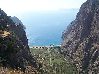 Faralya is a village in Lycia on the Mediterranean coast of Turkey, 15 km south of Ölüdeniz and 30 km south of Fethiye. It's best known for Butterfly Valley, a scenic canyon. Officially it's called Uzunyurt, which refers to the straggle of settlements comprising Kozağaç, Kirme, Hisar, Faralya, Kızılcakaya and Kabak (separately described). Nobody calls it that, but the name is apt, as it means "straggle of settlements, et cetera, et cetera". The strip around Faralya had a population of 640 in 2022.