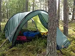 The main option is of course a tent. You might want to carry one even if you plan to use huts, especially in peak season (get warm and dry in the hut, but sleep in the tent, if you suspect another party may arrive later) or hiking in severe conditions (where you might not reach the hut before dark). In spring and autumn (when the conditions are mild and there are no or few mosquitoes even in the night) a tarp tent or similar shelter can be used instead of a tent.