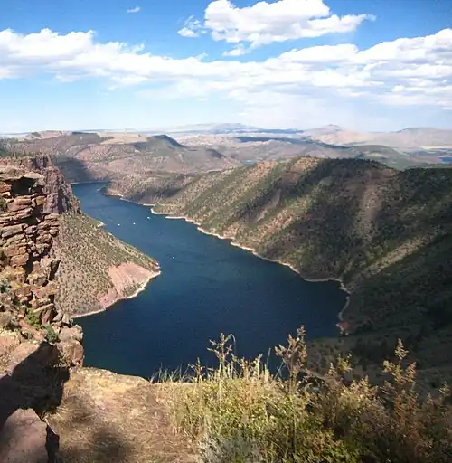 The Flaming Gorge National Recreation Area (NRA) is a large reservoir found within a canyon on the Green River. The reservoir contains 207,363 acres (839 km²) of land and water, which is divided almost evenly among Utah and Wyoming. The canyon was named by explorer John Wesley, who upon first looking at the red gorge believed that it was on fire.