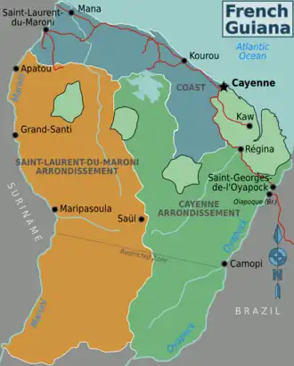French Guiana (French: Guyane or Guyane française) is an overseas French department and region in the Amazonia region of South America, bordering the North Atlantic Ocean, between Brazil and Suriname. It is governed as an overseas department of France with the same rights and privileges granted to all other French departments, and it benefits financially from the arrangement.