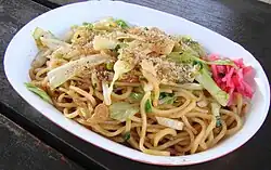 - Yakisoba. Fujinomiya is famous for its own version of Yakisoba (やきそば) -- check out any of the small shops with the big Yakisoba flag outside (usually orange in colour). There are several near the station. Some will cook on the table right in front of you. One characteristic is the thick, chewy noodles, some are made by the "Marumo" food factory right in the city. The other characteristic is ground meat, called ‘Nikukasu’ in Japanese. Yakisoba is one of the pride of Shizuoka. Considered "B-Grade Gourmet" - a term originated from the 1980s - which describes a variety of Japanese comfort food usually found in casual restaurants or sold as street food.