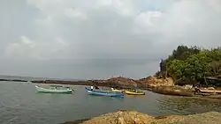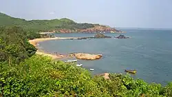 - 🌍 Kudle Beach (pronounced Kudlee) (The first beach you come to. About a 20-minute walk south from Gokarna main beach.). Kudle Beach is popular with those that are staying in town but want to spend the day at the beach. At the southern end of Gokarna beach, a narrow path goes up a hill, where you cross a Rama temple en route. This temple also has a natural water spring which according to the locals never stops running. The water is quite drinkable. After climbing up some stairs, you will find flat ground and some breath-taking views of Gokarna beach as you turn-around to see the distance you covered. As you move along, about 10 minutes walk from this place, the flat ground (a cricket field) leads to a narrow lane, which goes down to Kudle beach, the second of Gokarna's beaches. This beach looks very unkempt, desolate and dirty in off-seasons. You will hardly find a soul here then. But come season time between November - February, this beach will be dotted with hippies. Very few Indians are sighted on this beach, and mostly day trippers. Sunset-Cafe, on Kudle beach, is heaven if you are lazy and like to dig yourself into a rice pudding (and doze off in between).
