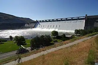 The small segment of the Columbia River at Grand Coulee flows north. This is the opposite of the river's normal flow from Canada to the Pacific Ocean. Photography can be a challenge due to the massive size of the dam, and the inability to get far enough away before passing the relatively short horizon. If possible, bring a wide-angle lens, and avoid the hours of the day when the sun is just barely above the dam face. Unfortunately, most of the time you'll be looking south and directly into the sun while viewing the dam.