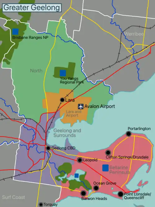 | Lara and Avalon Airport Includes the outer town of Lara, and the gateway to both Geelong and Melbourne, Avalon Airport. |