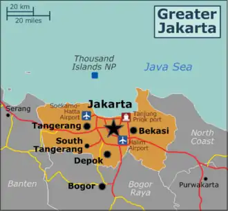 Greater Jakarta is a region in Western Java in Indonesia, including the national capital Jakarta and the surrounding region. The metropolitan area, which is one of the largest in the world, is also known as Jabodetabek. This travel guide covers this area with the exception of Bogor, which is in the article on Bogor Raya.