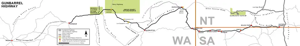 By any standard, this is a long and tough haul through very remote territory. Be sure to read the outback section of Driving in Australia. The track varies from stony to sandy with corrugations, ruts, washaways and sometimes mud. Be totally self-sufficient with water, food and fuel (the longest distance between fuel outlets is 489 km., between Carnegie Station and Warburton.)