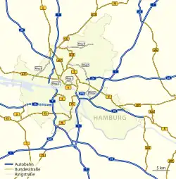 To the east (A24-Berlin) and northeast (A1-Lübeck/Rostock/Puttgarden-ferry to Denmark), you can start at the "Horner-Kreisel" and take the number 261 bus from U-Burgstraße to U-S Barmbek (exit BAB-Auffahrt Horn or walk from U3-Rauhes Haus).