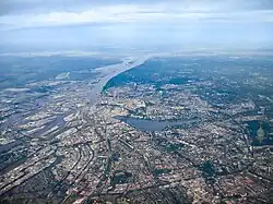 The Free and Hanseatic City of Hamburg (Freie und Hansestadt Hamburg) is Germany's second-largest city and, at the same time, one of Germany's 16 federal states or Bundesländer. Prior to the formation of the modern German state, Hamburg for centuries enjoyed a status as de facto independent city state and regional power and trade hub in the North Sea. Although situated over 100 km (62 mi) upriver from the North Sea on the Elbe, Hamburg has been one of Europe's most important ports for centuries, as reflected in its full name referencing the Hanseatic League. The city was built upon a number of islands formed by the wide river and its larger and smaller tributaries, and a huge part of its southern half is occupied by the massive port.