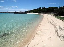 - Maenohama Beach (前の浜). Right in front of the ferry terminal and village, the beach is protected by breakwaters and thus not particularly picturesque, but good for swimming. Beware of currents further out in the channel.