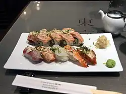 Sushi at a Japanese restaurant. - 🌍 Tokyo55, Runeberginkatu 55, ☏ +358 10 841 1111. Tu–F 16:00–00:00, Sa 14:00–00:00. The speciality here is sushi, served up by Japanese chefs, but there are also Finnish-styled options like maki rolls with smoked salmon and dill. Good selection of sake and Japanese beers. €30.