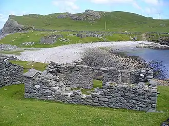 Hillswick is a small village on the Mainland of the Shetland Islands. It's the main settlement on the Northmavine peninsula, connected to the rest of Mainland by the road along Mavis Grind, the narrow isthmus by the village of Brae - so narrow you can almost hurl a stone from the Atlantic Ocean to the North Sea side. All of Northmavine in 2011 had a population of 741.