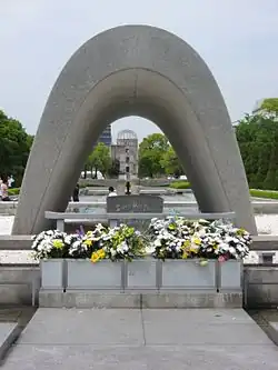 - Inside the 🌍 Cenotaph for the A-Bomb Victims is a stone chest with a registry that is intended to contain the names of every known person who died from the bombing, regardless of nationality. (Names are added as hibakusha pass away from diseases thought related to the radiation of the bomb.) The Japanese inscription reads, "Let all the souls here rest in peace, for the evil shall not be repeated." Note how the arch frames the A-Bomb Dome in the distance.