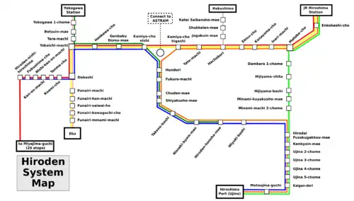 Hiroshima has an extensive tram (streetcar) network, which is operated by Hiroden (広電). It's a slow but reliable way of getting around. The trams themselves are a mix of old rattle-traps and sleek, new "Green Movers" — although they all run on the same lines for the same fares. There's no difference other than the smoothness of the ride. Because the trams were bought from other cities, you're getting a tour of Japanese transit history — some have been in service for more than fifty years, and that might be an old Kyoto tram taking you through Hiroshima. Trams 651 and 652, both of which survived the atomic bomb blast, are still sometimes used in regular service.