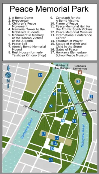 - 🌍 Peace Memorial Museum (平和記念資料館 Heiwa Kinen Shiryōkan), 1-2 Nakajima-chō, Naka-ku, ☏ +81 82-241-4004, hpcf@pcf.city.hiroshima.jp. Mar-Jul: 08:30-18:00, Aug: 08:30-19:00, Sep-Nov: 08:30-18:00, Dec-Feb: 08:30-17:00, closed Dec 30-31. This heart-wrenching museum documents the atomic bomb and its aftermath, from scale models of the city "before" and "after" to melted tricycles and other displays and artifacts related to the blast. Some are extremely graphic, evocative, and quite disturbing. The rest of the museum describes the post-war struggles of the hibakusha and an appeal for the abolition of nuclear weapons in the world today. Be warned: a visit here, while absolutely worthwhile, will ruin your day. Allow plenty of time afterward to decompress. Adults ¥200, high school students ¥100, children free. Audio guide ¥200.