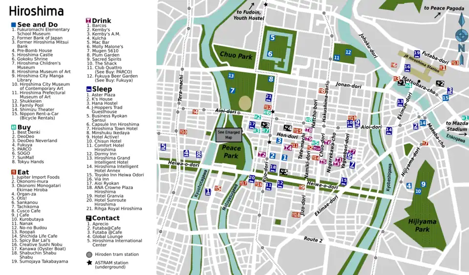 Generally speaking, addresses in Minami-ku (Minami Ward) are in the station area, while Naka-ku (Naka Ward) covers the Peace Park and its surroundings.