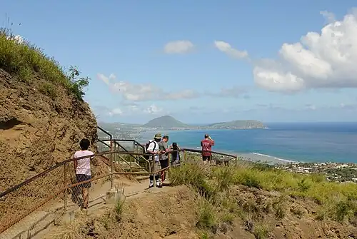 - π Diamond Head State Monument (from Waikiki, head south to Monsarrat Ave & turn right; Monsarrat becomes Diamond Head Rd and leads to the turnoff for Diamond Head). Daily 6AM-6PM; last entry at 4:30PM. One of the defining landmarks of Hawaii is this ancient volcanic crater which dominates over the surrounding area. An observation deck at the top offers breathtaking views of the southern coast of Oahu. After entering the monument through a short tunnel into the crater itself, you can hike up a 0.75 mile (1.1 km) trail from a parking lot in the crater to the rim, up a couple flights of stairs, through a tunnel and an old coastal artillery to the summit. The hike is very popular and not difficult, but the climb can be a little much for the average couch potato (bring water). $10/vehicle, $5/person.