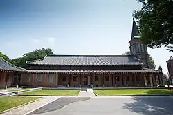 - 🌍 Nabawi Cathedral (나바위 성당), 146, Nabawi 1-gil, Mangseong-myeon. Nabawi Cathedral is a unique type of building that combines Korean and Western architecture. The front of the cathedral is decorated with a Gothic three-story vertical bell tower and an arched entrance, and the roof and walls maintain the traditional wooden hanok shape.