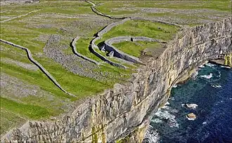 - 🌍 Dún Aonghasa (Dun Aengus), ☏ +353 99 61008. Daily Apr-Oct 9:30AM-6PM, Nov-Mar 9:30AM-4PM. A stone fort from 1100 BC perched on the edge of a sheer 100 m cliff. It's in a D-pattern with three ring-walls and an unusual outer chevaux de frise: a barrier of sharp upturned rocks of the kind used by the Frisians against cavalry charges. (What prehistoric military genius was expecting a cavalry attack from Frisia?) There's also a huge stone slab, of unknown but presumably grisly function. The walls have been reconstructed to a height of 6 m and are up to 4 m thick. It's possible the fort was once oval and lost half to cliff erosion, but true D-pattern forts are found elsewhere. Visitor vehicles and bikes come as far as the visitor centre, then you hike 1 km uphill to the fort, the trail is hard rock and slippery when wet. There are strong winds but no fence at the cliff edge, so grasp small children with a grip of steel. The site gets very touristy when all the day-trippers disgorge from their minibuses. Adult €5, conc €4, child €3.