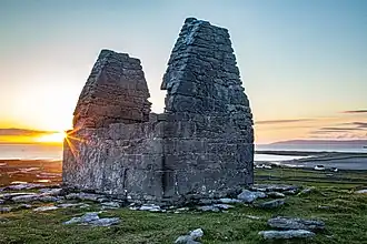Inis Mór (Inishmore) is the largest of the Aran Islands of County Galway, off the west coast of Ireland. The name simply means "big island" and there are half-a-dozen such places in Ireland, but this one is by far the largest of that name, with a population of 820 in 2022. It's a short ferry ride or flight from the mainland and the chief visitor attraction is Dún Aonghasa prehistoric fort. Cill Rónáin (Kilronan) is the main settlement.