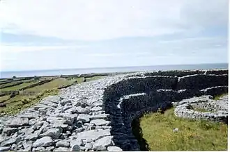 Inis Meáin or Inishmaan is the middle island of the three Aran Islands of County Galway in the west of Ireland. It's about 5 km by 3 km with a population in 2022 of 184, whose primary language is Irish. Like the others it's an extension of the mainland's limestone Burren, with stony terrain and precious little ground suitable for farming. It's the least touristy of the three but has transport and visitor amenities. Dún Conor ring fort is its main sight.