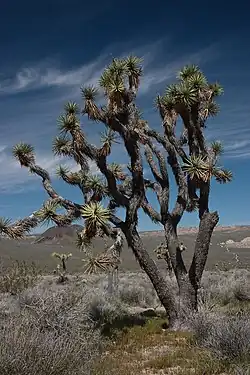 The name Joshua tree was reportedly given by a band of Mormons who crossed the Mojave Desert in the mid-19th century, the tree's unique shape reminding them of a Biblical story in which Joshua reaches his hands up to the sky. The Joshua tree is also called izote de desierto (Spanish, "desert dagger").
