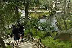 - 🌍 Kenroku-en Garden (兼六園), ☏ +81 762343800, fax: +81 762345292. Daily 07:00-18:00 in summer, 08:00-17:00 in winter (mid-October to end of February). The most famous sight in Kanazawa, the Garden of Six Attributes is considered one of Japan's Top 3 gardens. Once the outer pleasure gardens of the Maeda Lords, it gradually expanded to take over the entire block. While not completed in its final form until the waning years of the Edo Shogunate, it still represents one of the peaks of Japanese strolling garden design. The way in which water is piped from many kilometres upstream to fill its streams and ponds before going on to fill the castle moats is one of the great engineering feats of the Edo period. In part of the grounds, and with a steep separate ¥700 entrance fee, is the Seisonkaku Villa, built by a Maeda lord for his mother. Only part of it remains today, but is a rare example of existing daimyo palace architecture. The upper floor, with its bright blues and reds, is in distinct contrast to the muted earth tones of Kyoto style. During cherry blossom season, entry to the park is free and it's open and lit up until 21:00. ¥320 (free on Culture Day, Nov 3rd), and ¥100 for children age 6-17; ¥500 when combined with a ticket to one of several nearby museums..