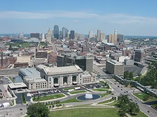 View of Kansas City from the top of Liberty Memorial. Union Station is in the foreground, with the rest of KC's skyline in the background.