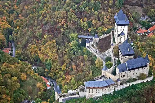 Karlštejn is a town approximately 20 km west of Prague best known for Karlštejn Castle. It is the most visited and one of the most beautiful castles in the Czech Republic. Construction of the castle was completed in 1365 under the reign of Holy Roman Emperor Charles IV. There is a national forest around the castle with some very nice hiking. Nearby in the village of Svatý Jan Pod Skalou you can visit a beautiful monastery including the 'holy cave' that it was built upon.