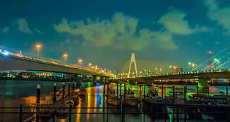 Geographically, Kawasaki lies in the middle of the Keihin (Tokyo-Yokohama) region, separated from the Tokyo metropolis by the Tama River, which it roughly follows, and is divided into seven wards. The eastern part of Kawasaki, along Tokyo Bay, contains industrial work areas and blue-collar housing, while more upscale buildings can be found in the Tama Hills further west and inland.