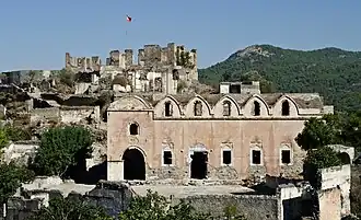 - 🌍 Kayaköy abandoned village is ranged over the slopes south of the present settlement, with 500 houses standing in ruins. Best preserved is the lower church (Aşağı Kilise) as this was used for a time as a mosque. The "upper church" is 50 m south, and a 20 min walk (waymarked by red dots) brings you to the hilltop chapel. The site is nominally open daily 08:30-20:00, but that's just when the ticket kiosk is open: hikers on the trail to Cold Water Bay can pass through free by avoiding those hours. In any case avoid the midday heat, as the site lacks shade. In 2024 entrance cost 100 TL.