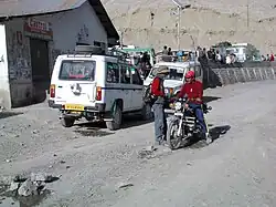 The road from Shimla (via Rekong Peo) is in theory an all-season one. HRTC buses link Kaza with Manali and Rekong Peo. The Rekong Peo connection passes through landslide area at Malling Nullah, with transshipment (crossing on foot and being picked up by a bus on another side) being frequently the only way of passing the landslide. Many people will hire shared taxis or book with a tour group that stops in various towns like Shimla, Sangla, Kalpa, and Nako along the way.