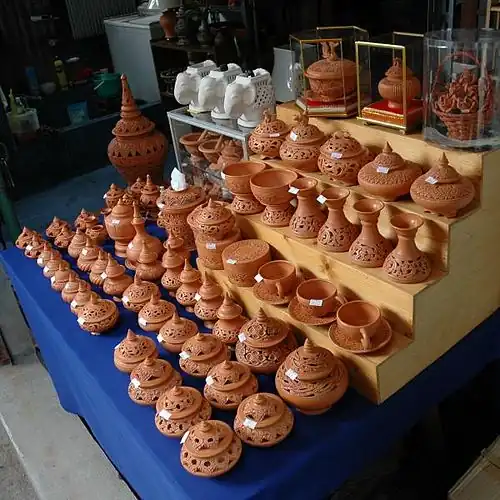 Ko Kret is renowned above all as a centre for kwan aman, a style of Mon pottery, which is fundamentally just baked unglazed red clay carved with intricate patterns. Prices for the simplest and smallest pots start from 5 baht, but can go up to hundreds or even thousands of baht for large ornate pieces. Particularly popular among visitors are candle and incense holders with ornate patterns of holes to let the smoke or light out, costing around 200 baht.