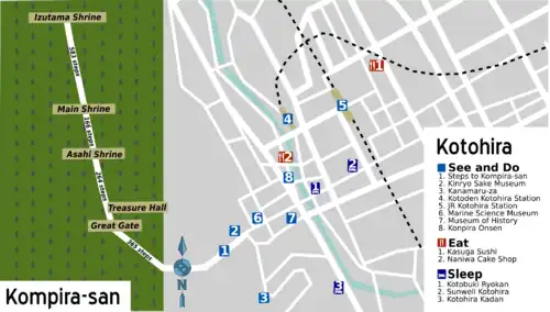 - Konpira Onsen Kotosankaku (こんぴら温泉郷 琴参閣), 685-11 Kotohira-cho, ☏ +81 877-75-1000. 11:30-16:00. Stop in if you need a soak after the walk up to Kompira-san — or, if you're really sore, switch your accommodation to one of the several hotels that comprise this hot spring "village". Adults ¥1200, children ¥630.