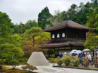 - 🌍 Ginkakuji (銀閣寺, or Jishoji 慈照寺), Ginkakuji-chō (nearest bus stop: Ginkakuji-michi, routes 5, 17, 32, 100, 102, 203, 204), ☏ +81 75-771-5725. Mar-Nov 08:30-17:00; Dec-Mar 09:00-16:30. This temple, known as the Silver Pavilion and restored between 2008 and 2010, is at the northern end of the Philosopher's Walk. Much like its golden counterpart Kinkakuji, the Silver Pavilion is often choked with tourists, shuffling past a scrupulously-maintained dry landscape Zen garden and the surrounding moss garden, before posing for pictures in front of the Pavilion across a pond. Unlike its counterpart, however, the Silver Pavilion was never actually covered in silver; only the name had been applied before the plans fell apart. Be sure not to miss the display of Very Important Mosses! Admission ¥500.
