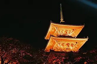 - 🌍 Eikandō Temple (永観堂禅林寺), 48 Eikandō-chō, Sakyō-ku (nearest bus stop: Nanzenji/Eikando-michi, route 5), ☏ +81 75-761-0007. Daily 09:00–17:00. A large temple said to have been constructed by Priest Kūkai. The temple features a unique statue of Amida Buddha, Mikaeri Amida, that looks to the right rather than facing forward; there's a charming legend attached to it. The temple grounds also feature a Tahōtō pagoda and a lake. The temple is particularly pleasant in the autumn when the leaves are changing (and the admission fee jumps to ¥1000; also, during the peak leaf season, the grounds close at 16:00 and reopen at 17:00 for an additional viewing session (¥900) where the trees, buildings and paths are illuminated by hundreds of lights). Matcha sets under the trees, on the benches set off the main path, ¥500. Regular admission ¥600.