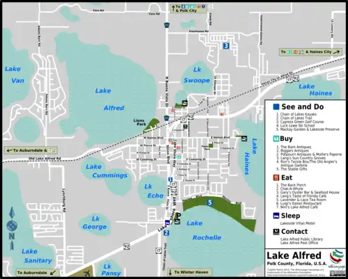 - 🌍 Lake Alfred Chamber of Commerce, 115 E Pomelo St (S side of Pomelo St, just E of NB U.S. 17/92.), ☏ +1 863 875-8700, fax: +1 863 875-8700.