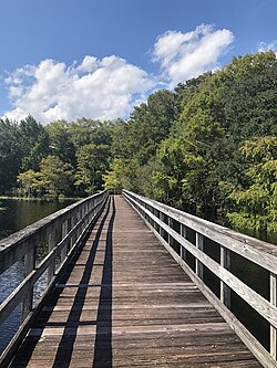 - 🌍 Deep Creek Preserve, 964 S FL-415. A park with some hiking trails southwest of New Smyrna Beach. The park includes some spaced-out pine woodlands, along with an appropriately-named creek, around which is some relatively lush flora. Benches are spread out along the route. The park has a couple of trails, some of which are not too clearly marked, but colored signs are used to mark the trails, along with arrows and symbols (horses and people) to represent trails specifically intended for a certain type of use. There is a wide dirt road that divides the forests and crosses the park, but it's best to avoid hiking on this road when possible as its surface is thick, making hiking difficult.