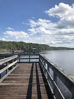 Once you are over the lake, the boardwalk turns about 90 degrees to the left and you will immediately have a few across the lake. On a normal weather day there is only a gentle ripple or small wave effect on the lake. The boardwalk makes a couple curves as it crosses the lake, in the middle going out from the shoreline into the lake. There are a couple places where the boardwalk widens by a foot or two to accommodate wooden bench seating, and roughly half the way across the lake is a gazebo frequented by fishermen. In its entirely the part of the boardwalk above the lake's surface is probably one or two hundred yards. While crossing the lake, tall pines can be seen lining the distant shore marking the boardwalk's re-entrance to the forest; to the right (south) you can see or two small, private piers, which are not accessible from the boardwalk trail.